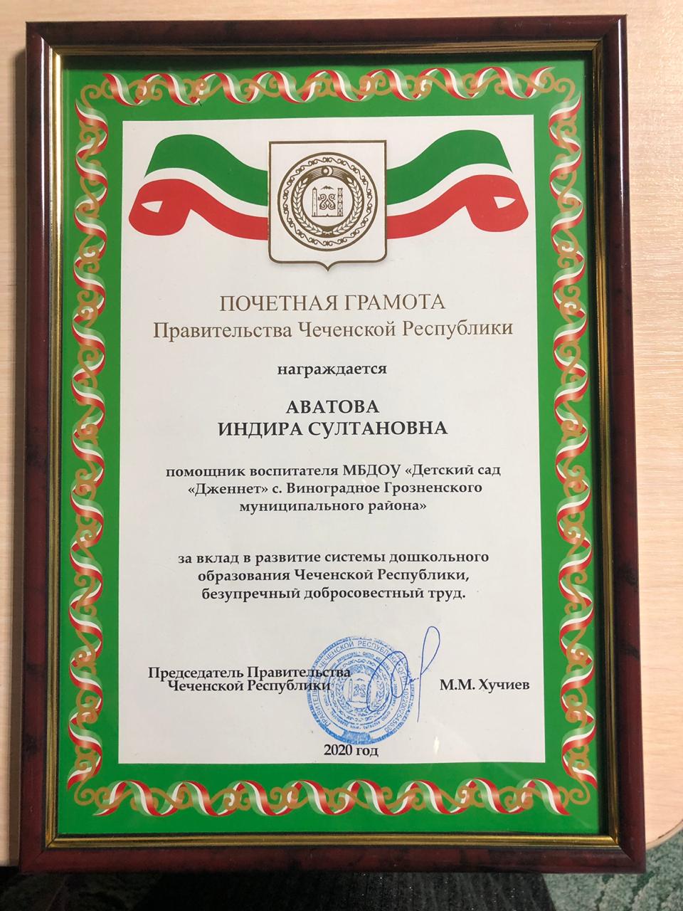 04.12.2020Поздравляем Аватову Индиру Султановну с получением Почетной грамоты Правительства Чеченской Республики, которая является прямым подтверждением её высоких личностных качеств.Желаем, чтобы каждый день твоей жизни был достойной наградой за старания, упорство и стремление к успеху.