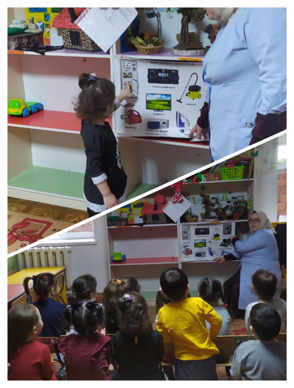 Цель: формировать понятие "бытовые приборы"; учить дифференцировать бытовые приборы по их назначению; утюг гладит, пылесос собирает пыль, стиральная машина стирает; воспитывать трудолюбие, аккуратность в обращении с бытовыми приборами.