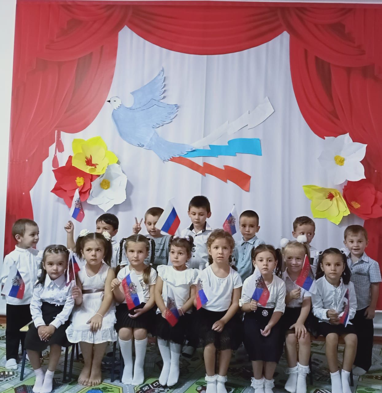 Цель мероприятия: воспитывать патриотические чувства, уважение к Государственному флагу России через художественное слово и музыку; воспитывать эмоционально- патриотические отношения к символике России, чувство любви к Отечеству, гордости за него.