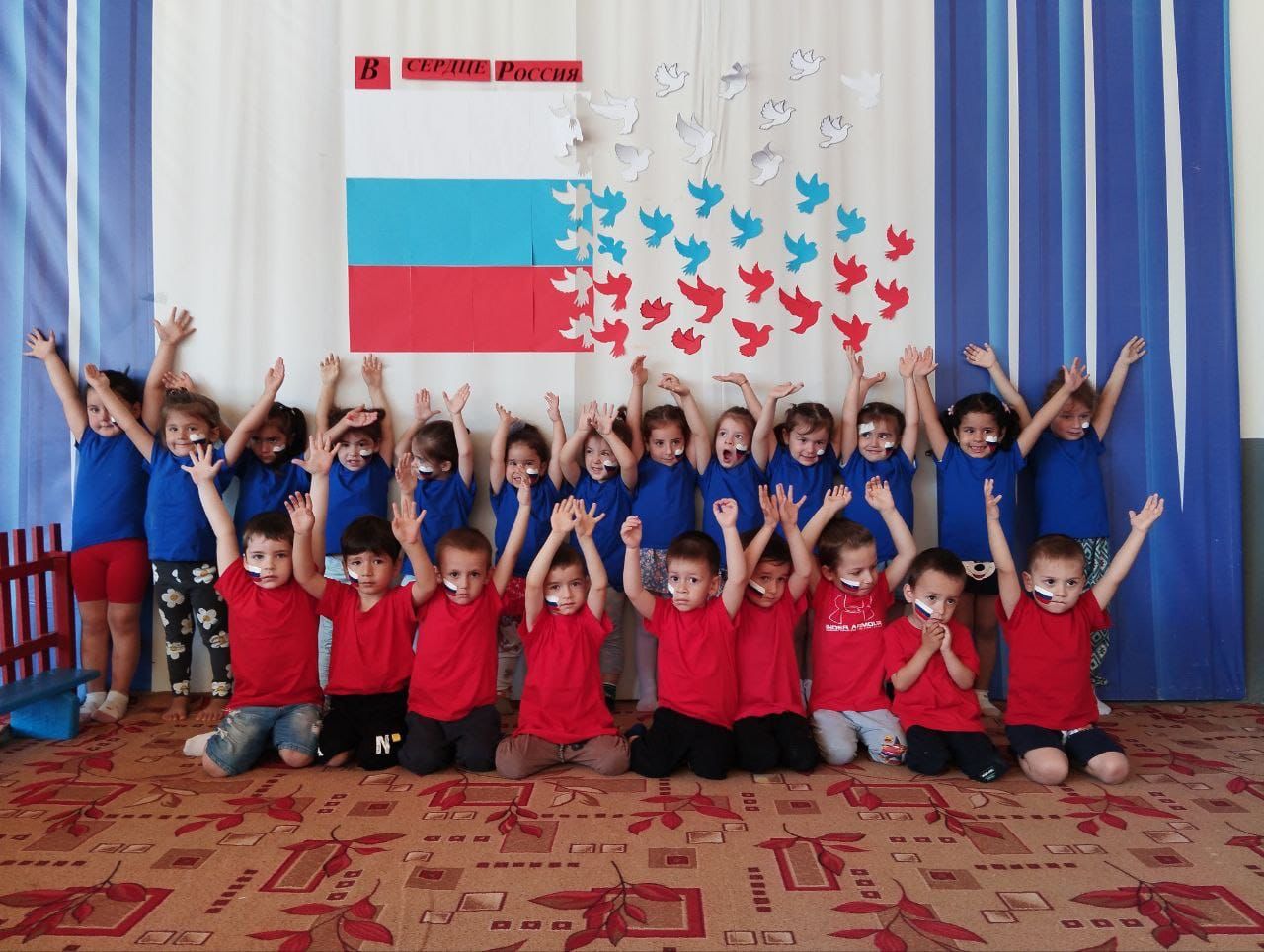 09.06.2023Согласно плану летнего оздоровительного периода на 2023 год, в нашем ДОУ провели мероприятия посвященные ко Дню России. 12 июня в нашей стране отмечается День России. Это самый молодой государственный праздник. Официальное название этот праздник получил только 1 февраля 2002 года и стал называться День России – символ национального единения и общей ответственности за настоящее и будущее нашей родины России. День России – это отличный повод рассказать детям ещё раз об истории нашей огромной и самой красивой в мире многонациональной страны, о многообразии народных традиций, совершить интересные увлекательные путешествия по просторам нашей необъятной Родины.08.06.2023г. В старшей группе «Крошки» провели беседу «Россия Родина моя».Цель проведения беседы: формирование у детей интереса, любви к Родине, чувства гордости; воспитание уважительного отношения к символам страны; любви и уважение к малой Родине; приобщение детей к здоровому образу жизни; формирование у детей представление о том, что День России – это праздник свободы и гражданского мира. В младшей группе «Чебурашки» провели флешмоб «Я люблю Россию».Воспитатели провели акцию с детьми «В сердце Россия».Цель проведения акции, формировать у детей представление о том, что День России – это праздник свободы и гражданского мира. Праздник проходил на улице во дворе детского сада, дети читали стихи, пели гимн. Воспитатели, приняли активное участие в проведении праздника. Эмоциональный настрой детей был на высоком уровне. Праздник прошел в доброй и дружеской обстановке.