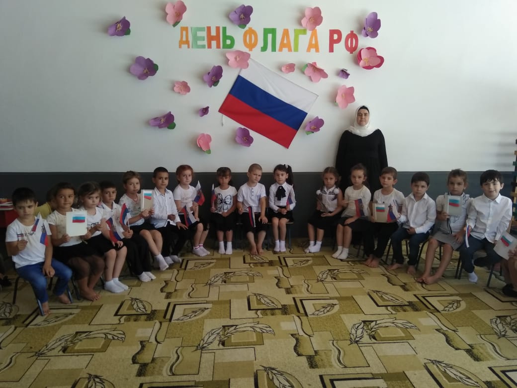 21.08.2018Ст.группа"Крошки" провели мероприятия посвящённое ко Дню Российского флага. Цель мероприятия: Формирование у детей чувств патриотизма: гордости за свою Родину, любви к родному краю. Познакомить детей с государственным флагом России. Познакомить со значением цветов, изображённых на флаге. Закрепить государственные символы: флаг, герб, гимн.